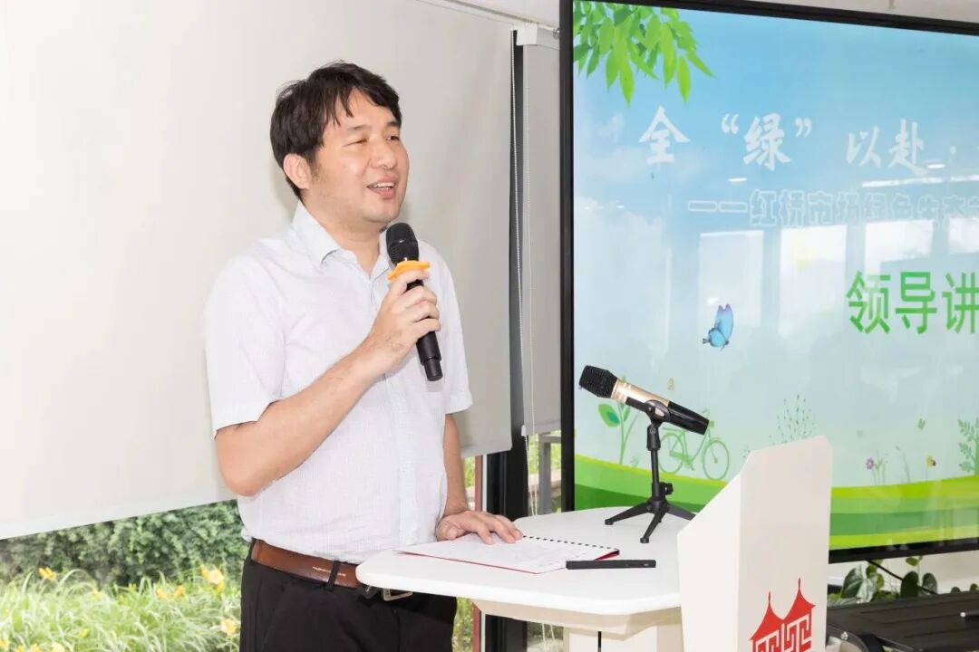 北京市发展和改革委员会执法处三级调研员吴云首先对红桥市场通过“红色党建引领,绿色低碳发展”的实践, 实现企业生态、经济和社会效益共赢给予了充分肯定。她指出,红桥市场见证了北京经济社会发展的变迁。当前,绿色发展已成全球共识,北京正建设“国际绿色经济标杆城市”与“全球数字经济标杆城市”。吴云强调,在此背景下,红桥市场党组织积极作为, 探索绿色生态前沿技术在既有公共建筑的应用,为城市更新和产业发展树立了标杆。她希望与会各方以党建为纽带, 深化交流合作,发挥各自优势,在绿色转型道路上迈出新步伐,在党组织的坚强领导下, 共同为推动经济社会全面绿色转型、实现美丽中国建设贡献北京智慧。